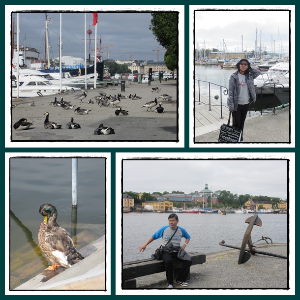 Kami lanjut menyusuri tepian laut. Banyak kapal layar yang parkir di sini. Sama seperti di Oslo, di sini banyak orang punya kapal pribadi. Enak juga menyusuri pinggir pulau Djurgaden. Selain lihat kapal, bisa lihat bebek dan burung yang pada berjemur. Lucu banget, mereka memenuhi jalanan. Rupanya pada cari matahari. Lumayan sih memang hari ini cuacanya agak hangat.