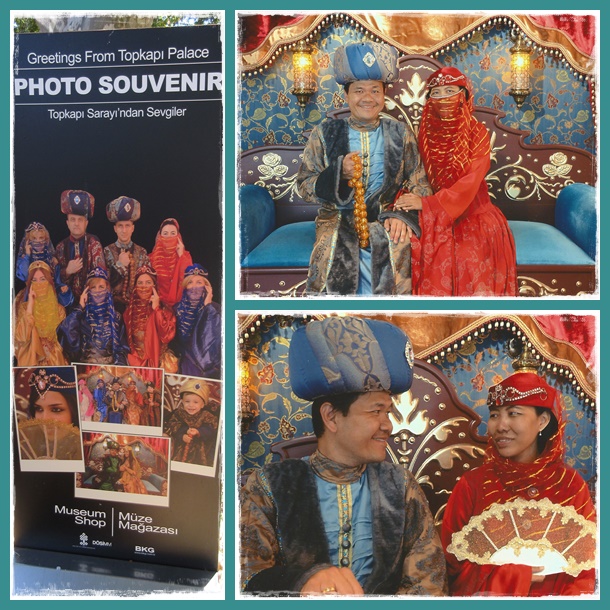 Di bagian taman umum Topkapi yang gratis itu, ada toko souvenir dan studio foto untuk berkostum serupa Sultan dan kostum bangsawan jaman Ottoman dahulu. Menarik nih, tapi waktunya udah ga keburu. Oke, nanti saja setelah tour selesai, kami akan kembali lagi ke sini untuk berfoto di studio ini. Maklum, kami sangat suka memiliki souvenir berupa foto dengan kostum negara setempat.