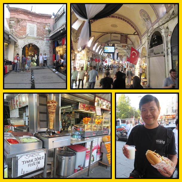 Perjalanan menuju ke Grand Bazaar (Kapali Carsi) penuh perjuangan karena kami ‘menentang’ sinar matahari yang terik. Walau sudah pakai kacamata hitam, tetap saja membuat mata ini menjadi lelah. Grand Bazaar ini sangat besar, luas dan memiliki beberapa pintu masuk. Hati2 nyasar yah di dalam. Kami masuk melalui pintu tujuh. Banyak sekali pedagang dengan berbagai jenis dagangan yang ditawarkan seperti makanan, tekstil, dan souvenir pastinya.