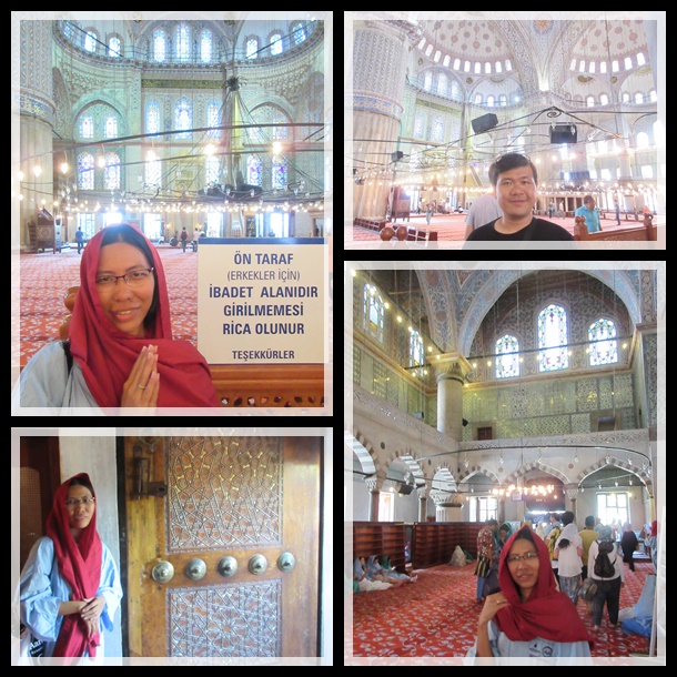 Dari Topkapi Sarayi, kami diajak ke Blue Mosque. Disebut masjid biru karena interiornya didominasi oleh keramik warna biru, bukan karena eksteriornya warna biru. Blue mosque memiliki 6 buah minaret/menara. Jumlah minaret menunjukkan “keagungan” masjid tersebut. Di Istanbul kita bisa melihat masjid lain yang hanya memiliki 2 atau 4 minaret.