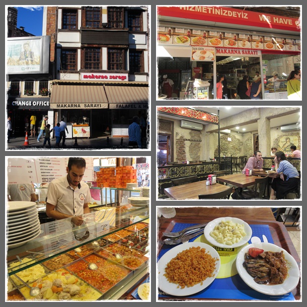 Tempat2 makan seperti ini ternyata banyak ditemui di Istanbul. Mirip makan di warteg yaitu makanan semua sudah tersedia dan kita tinggal pilih2 sendiri makanannya. Macam menunya beragam. Ga usah tau namanya, kita tinggal tunjuk yang penampakannya menarik, hehe.. Kami memilih nasi kuskus (kayak nasi goreng merah dan agak pedas), pasta lalu terong + daging (kami tidak tau namanya).