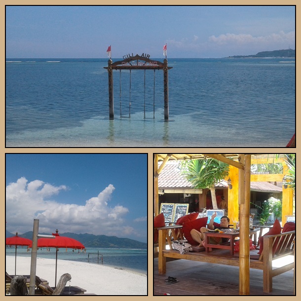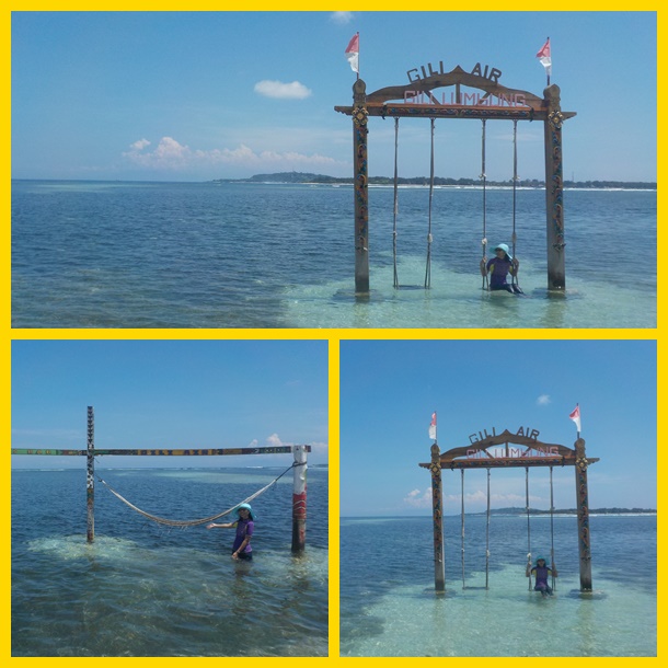 Hammock nya lumayan tinggi, agak susah nih naiknya. Ukuran bule kali ya, hehe.. Jadi main ayunan nya saja deh. Ayunan ini ternyata dipasang oleh salah satu restoran yang ada di pantai, namanya Gili Lumbung. Pintar juga ya cara menarik pengunjung nya. Kami salah satu yang akhirnya tertarik untuk makan di situ karena pemandangannya keren dan tempatnya asik buat bersantai.