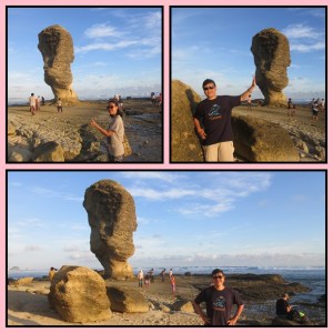 Batu Payung adalah objek wisata dengan bentuk batu yang unik dan menjulang tinggi di tepian pantai di balik bukit. Saat kami tiba, sudah banyak turis di sana. Namun selain mereka, banyak juga orang dewasa dan anak kecil yang menawarkan jasa memotret. Ternyata mereka bisa membantu wisatawan mengambil foto (tentu saja kamera sendiri) dengan gaya dan pose menarik, memanfaatkan keberadaan batu unik tersebut. Tentu saja ada tarifnya. Beberapa orang dewasa lainnya menjual kelapa muda. Karena kurang laku dibandingkan jasa foto, maka mereka sempat menawarkan untuk beli kelapa muda dan nanti dapat gratis foto. Kreatif juga.
