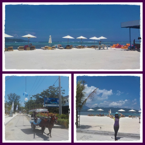 Dari tempat kapal mendarat, kami jalan ke kiri menyusuri jalan. Panas menyengat. Sangat mirip dengan saat dulu di Gili Trawangan. Aah, coba jalan di pantainya saja sambil menyegarkan kaki di air laut. Ternyata pemandangan pantai di sini sangaaaaat indah !! Kami langsung jatuh hati dan merasa ini lebih keren lagi dari Gili Trawangan karena selain indah juga suasana nya sepi. Romantis, mirip Maldives ! Coba saja bandingkan dengan foto Maldives trip (2015).