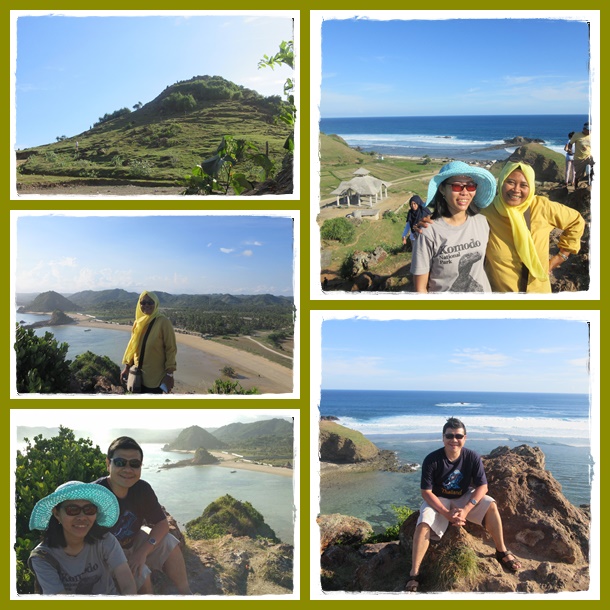 Tiba di atas puncak bukit, kami bisa melihat bentangan laut yang luas dan sangat biru. Kami pun bisa melihat pantai hotel Novotel yang berupa teluk. Wah betah banget nih mata melihat pemandangan dari sini. Betul-betul jadi seger…. Tapi hati2 ya, di atas bukit tempatnya tidak terlalu luas. Kita harus berbagi dengan pengunjung lain. Menuruni bukit Seger pun menjadi pengalaman menarik dan menantang, sama seperti tadi menaikinya. Perlu hati-hati agar tidak terpeleset dan terperosok.