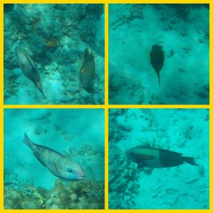 Tiba di spot snorkeling, ternyata belum ada kapal lain di situ. Rupanya masih pagi. Rombongan snorkeling yang lain belum berangkat kali ya. Kami pun langsung nyebur dan menjajal alam bawah laut di sini. Hm.. terumbu karang nya sudah mati, tidak ada yang bagus. Tapi ikannya lumayan menarik. Ada yang aneh2, ini yang kami cari, hehe.. termasuk box fish yang kami jumpai saat snorkeling di Bunaken.