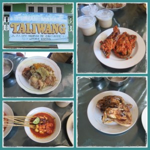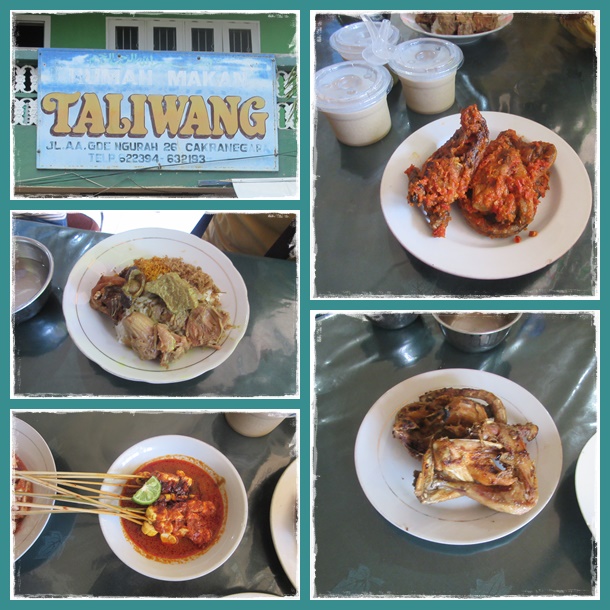 Di mataram, kami mau makan ayam taliwang, makanan khas nya Lombok. Dulu kami makan di hotel dan di ariport, sekarang mau yang asli di kotanya aah. Taliwang merupakan salah satu nama desa yang ada di Mataram. Jadi ada satu jalan yang banyak sekali penjual ayam taliwang. Yang membedakan adalah bumbunya. Kami diajak ke salah satu restoran ayam taliwang yang merupakan pelopornya. Bukan di daerah Taliwang, melainkan di daerah Cakranegara. Namanya rumah makan “Taliwang”.