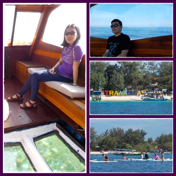 Kami minta dijemput pk.08.30 namun ternyata jam 8 sudah ada supir yang datang ke hotel. Wah, kami masih sarapan nih. Oke, layanan yang bagus, sudah tiba sebelum waktunya. Setelah check-out, kami pun diantar ke pelabuhan Kecinan, tempat boat charteran yang posisinya sebelum Bangsal. Katanya lebih dekat untuk menuju Gili. Kapal kami sesuai yang ada di website Lombok Society, warna coklat kayu yang teduh dan nyaman. Merupakan glass bottom boat, ada kaca nya di bagian bawah untuk lihat bawah laut tanpa basah2an.
