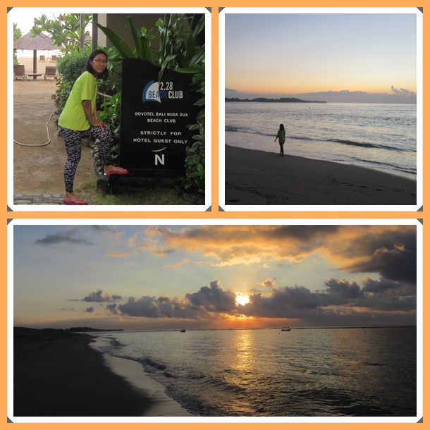 Pagi ini, kami mau menikmati sunrise di pantai. Novotel Nusa Dua tidak memiliki akses langsung ke pantai, tapi disediakan private beach untuk tamu hotel. Mulai jam 8 pagi hingga jam 8 malam, selang 15 menit sekali, ada shuttle yang membawa tamu hotel ke private beach tersebut. Namun berhubung masih pagi, kami berdua harus jalan kaki ke pantai itu. Ga jauh sih, jalan sekitar 10 menit. Namanya 2.28 Beach Club Novotel Nusa Dua.