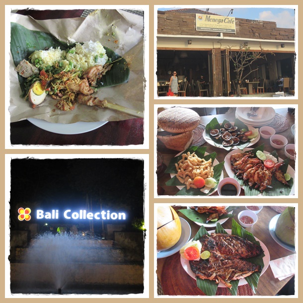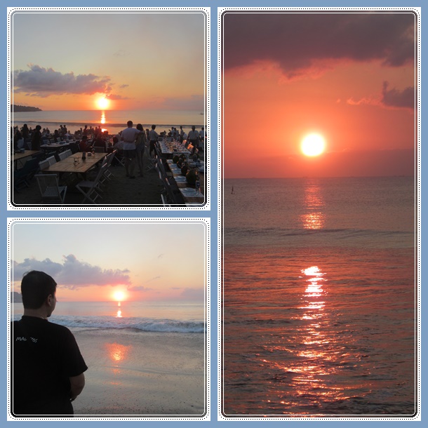 Sore harinya, kami berlima pergi ke Jimbaran. Sebenarnya banyak sekali restoran sea food di Jimbaran, tapi yang paling terkenal dan kami datangi sore itu adalah Menega Cafe. Saat ditanya apa yang membedakan Menega dengan restoran lain, menurut orang2 adalah pada rasa bumbu sea foodnya. Menu kami sore ini adalah : ikan red snapper bakar, cumi goreng tepung, udang bakar dan kerang bakar. Nasi, sayur kangkung, kacang bali, dan sambal matahnya free flow. Bahkan dikasi buah juga loh. Gratis. Sambil menikmati makanan yang porsinya bikin kenyang banget, kami juga menikmati sunset sore itu yang terbilang sempurna.