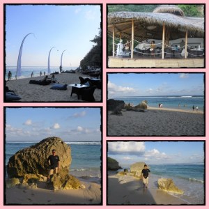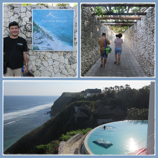 Kami melanjutkan perjalanan menyusuri pantai di belakang hotel2 mewah di area Nusa Dua dan akhirnya kembali ke hotel. Ambil ransel di hotel dan kemudian kami dijemput oleh Sugi & Michaella. Kali ini kami mau diajak main ke Karma Kandara. Itu adalah salah satu dari sekian banyak beach club yang terkenal (mahal) di Bali. Ada resortnya juga. Mereka mengajak karena mereka member di sana, jadi bisa masuk gratis dan bisa membawa teman masuk secara gratis juga. Wah.. kami beruntung sekali. Cihuy.. Kalo non member bayarnya per orang 500 ribu. Terdiri dari 200 ribu untuk entrance fee dan sisanya 300 ribu bisa ditukar dengan makanan dan minuman.