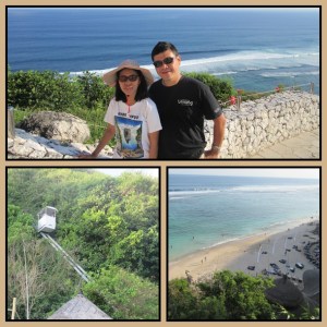 Di bagian atas ada registrasi. Turun satu lantai, ada restoran. Turun satu lagi, ada kolam renang. Keren banget, semua pemandangannya menghadap laut lepas. Buat turun ke pantainya, yang jauuuuh di bawah sana, kita harus naik semacam kereta mini dengan rel yang jalurnya cukup terjal. Kapasitasnya hanya maksimal 6 orang termasuk 1 orang staf yang mengoperasikannya. Jadi ingat pengalaman kami naik funicular model begini saat trip Bern-Swiss (2012) dan lift kaca mini di The Valley Resort Hotel Bandung.