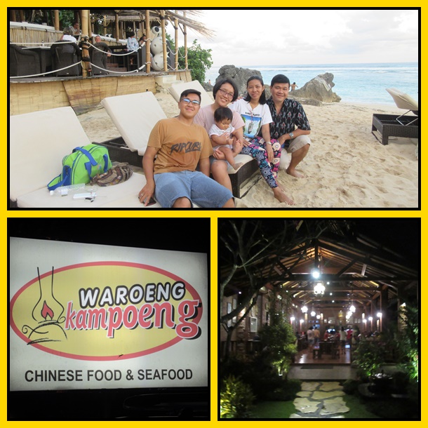 Puas menikmati Karma Kandara, kami pun pergi makan malam di resto Waroeng Kampoeng. Lokasinya di Nusa Dua, restonya tidak terlalu besar dan terbuka tanpa AC. Saat kami makan, rasanya tidak ada lagi meja yang kosong. Katanya resto ini memang termasuk laku, banyak bule2 yang makan di sini. Rasanya enak, porsi cukup kecil sesuai harganya yang murah. Buat kami sih pas.