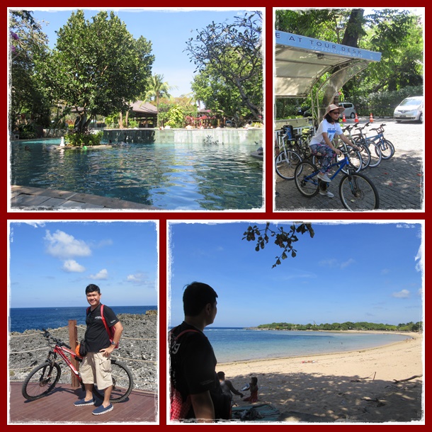 Walau sudah check-out jam 12 siang, tapi pesawat kami kembali ke Jakarta masih malam hari. Jadi siang sampai sore ini masih bisa santai di Bali. Kami titip ransel di resepsionis, makan siang di hotel, lalu sewa sepeda. Ada sepeda tendem jika mau berdua, tapi kami memilih sewa 2 sepeda single supaya lebih leluasa. Harga sewa 1 sepeda per jam adalah Rp. 35.000,-. Namun jam 12 hingga jam 3 siang ada promo happy hour, dapat discount 20%.
