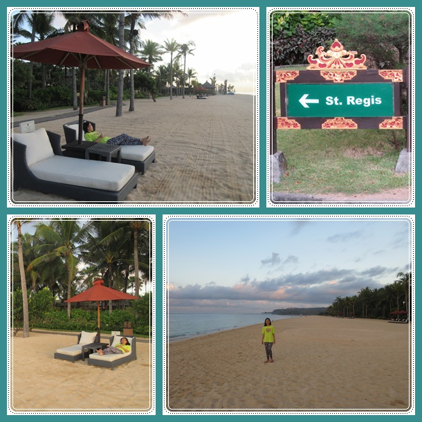 Kami main2 ke area pantai nya, keren banget. Bahkan foto2 sambil tiduran di kursi pantai yang sebetulnya private milik villa-villa St.Regis. Ga lama tiduran di situ, kami lalu pergi karena diperhatikan security sana. Haha.. Ketauan banget ini bukan tamu St.Regis, tamu lain semuanya bule bo !