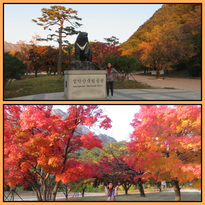 Pukul 07.00 pagi kami masuk ke kawasan Seoraksan National Park. Enak nih pagi2 begini masih sepi. Wisatawan yang pada mau ke Seoraksan biasanya menginap di kota Sokcho, dan naik bis dari Sokcho ke sini butuh waktu sekitar 30-45 menit. Jadi kalo menginap di Kensington memang sangat diuntungkan. Pagi2 tinggal jalan sudah sampai. Begitu masuk, kami sudah terkagum-kagum dengan pemandangan dan pohon warna warni yang sangat meriah. Apalagi hari ini cuaca cerah, matahari bersinar menambah semarak warna warni tersebut.