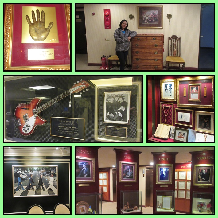 Pemandangan dari jendela kamar kami langsung menghadap Mt. Seorak. Spektakuler ! Setelah mengecek semua kondisi kamar dan istirahat sebentar, kami pun mulai menjelajah hotel ini lantai demi lantai. Ternyata hotel ini sangat luar biasa. Di lantai 5-8 itu kamar-kamar, tapi di sepanjang lorongnya sudah seperti museum. Ada memorabilia orang2 terkenal yang pernah menginap di sini :