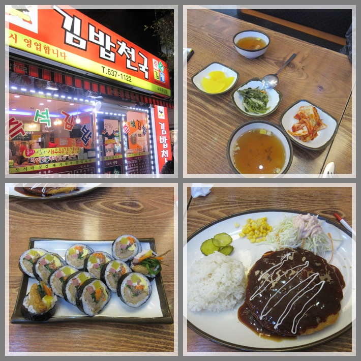 Di sini jual macam2 menu. Karena yang terkenal itu gimbapnya, kami pun coba pesan. Gimbap nya pun sangat beragam. Bisa pilih mau yang isi daging, keju, kimchi, dsb. Harganya KRW 3.500 saja, enak dan cukup kenyang. Selain itu kami juga pesan pork cutlet seharga KRW 6.500. Lagi-lagi porsinya besar. Jadilah kekenyangan banget malam ini. Sama seperti di restoran Korea pada umumnya, selalu ada side dish dan air minum gratis yang bisa diambil sendiri.