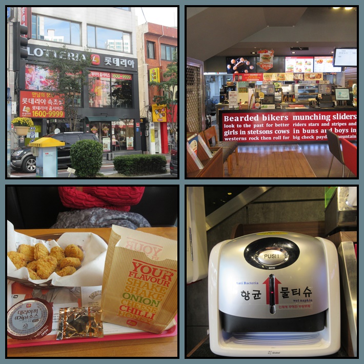 Makan di mana ya kali ini ? Mulai bosan dengan makanan Korea, kami makan di Lotteria aja deh. Lokasinya tidak jauh dari tempat makan malam kami kemarin. Pilih menu semacam nugget dengan saus teriyaki serta french fries dengan bumbu keju. Enak ! Ada yang unik nih di sini, alat yang ketika dipencet tombolnya bisa mengeluarkan tissue basah yang steril. Wah, keren.. higienis banget.