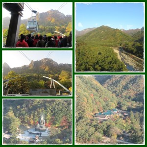 Di dalam cable car, ada satu staf yang membuka dan menutup pintu cable car. Sepanjang perjalanan naik ke atas, dia memutar musik Korea yang mendayu dayu gitu. Duh romantis banget jadinya. Perjalanan ke atas kurang lebih 5 menit. Kita bisa lihat pemandangan sungai, bukit dengan pohon yang berwarna, Sinheungsa temple dan patung Budha bronze dari atas karena dinding cable car semuanya kaca.