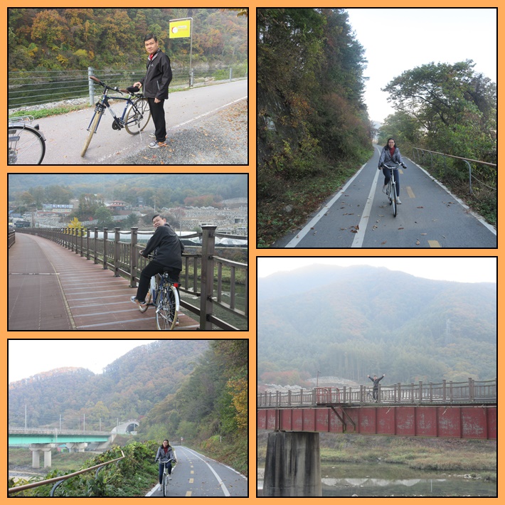 Selesai sarapan, kami meminjam sepeda pada pemilik hostel. Memang di hostel ini bisa gratis peminjaman sepeda. Rupanya sepeda yang dimaksud adalah milik pribadi keluarga pemilik hostel. Jadi ada 2 sepeda dewasa dan 2 sepeda anak. Di belakang hostel memang ada jalur khusus sepeda, menyusuri sungai dengan perbukitan yang cantik, melewati jembatan, melintasi hutan, seru deh tapi dingin banget.