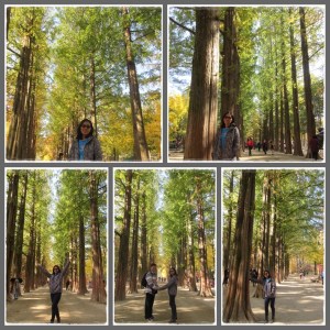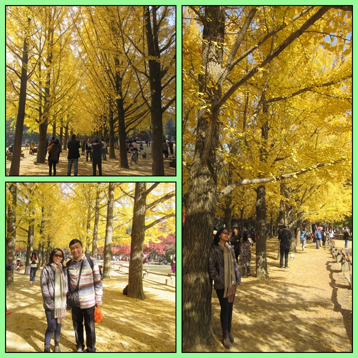 Ada juga Metasequoia lane yang khas Nami Island. Batang yang kokoh dan tinggi. Daunnya memang berwarna hijau, jadi bukan berarti dia belum berubah warna ya. Di Nami ini banyak sekali deretan pohon di tempat yang berbeda-beda dengan jenis pohon yang berbeda juga. Makanya warnanya juga bisa beda-beda semua walaupun di musim yang sama.