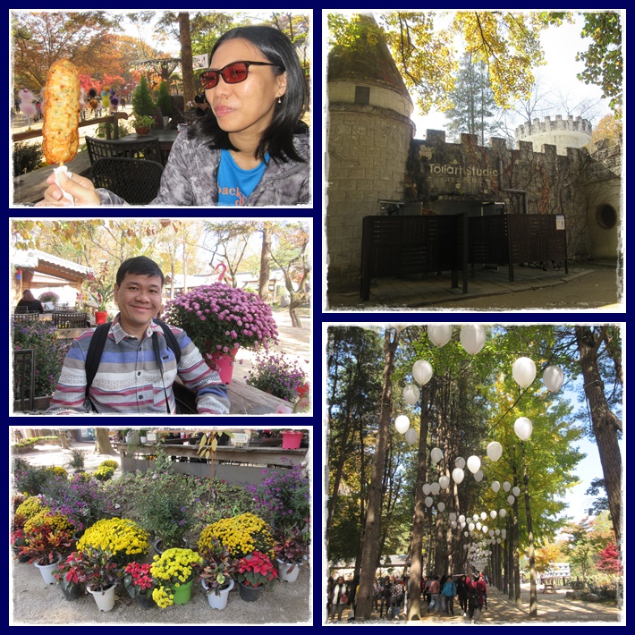 Udah banyak jalan2, kami sempat jajan Fried Fish Cake , seperti otak2 ikan seharga KRW 3.000. Enak ! Banyak bunga2 dalam pot juga menghiasi beberapa tempat sehingga menambah semarak. Bentuk toilet di sini juga seru2 loh, nyeni banget. Ada yang bentuknya seperti kastil, ada yang dihiasai banyak potongan botol beling, macem2.