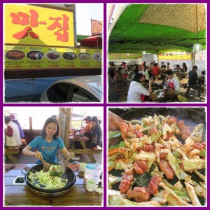 Kami menghabiskan waktu sekitar 3 jam di Nami Island dan buat kami sih cukup. Saat kami pulang sekitar jam 1 siang, ternyata orang yang baru datang banyaknya ampun ampun. Untung aja kami udah beres foto2nya. Makan siang dulu deh di dekat parkiran Nami Island. Menurut host kami di Sokcho, makanan khas Chuncheon (tempat Nami Island berada) adalah Dakgalbi. Kami mencoba cari tempat makan yang agak kosong, karena rata2 antri. Nah, akhirnya ketemu yang semi outdoor.