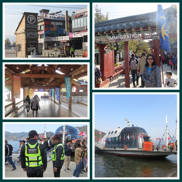 Kami sih pilih yang gratis, aman, dan cepat saja, yaitu naik ferry. Di sepanjang pagar ferry, terpasang bendera2 dari berbagai negara termasuk Indonesia. Ga banyak kursi di dalam ferry, toh hanya sekitar 10 menit, sudah tiba di Nami Island.