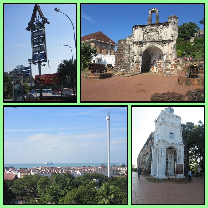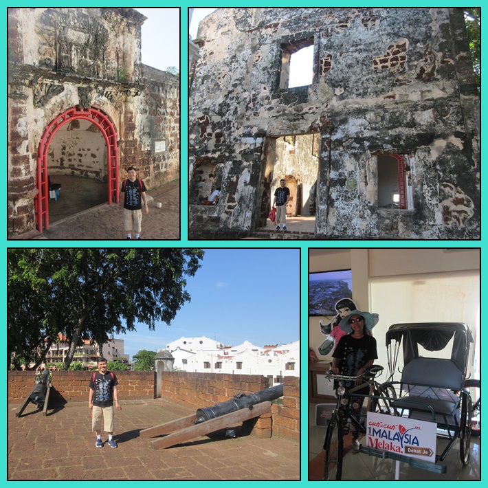 Kami sempat berjalan kejauhan, jadi akhirnya sampai pertama di reruntuhan gerbang peninggalan Portugis, yaitu A Famosa. Di sebelahnya ada Melaka Sultanate Palace Museum. Naik ke atas bukit, lumayan terjal juga, bisa ditemui reruntuhan gereja St. Paul. Sebuah reruntuhan dengan dinding yang masih utuh, namun tidak ada atapnya. Dari lokasi ini, kami bisa melihat pemandangan kota Malaka, termasuk melihat kapal Costa Cruise nun jauh di sana.