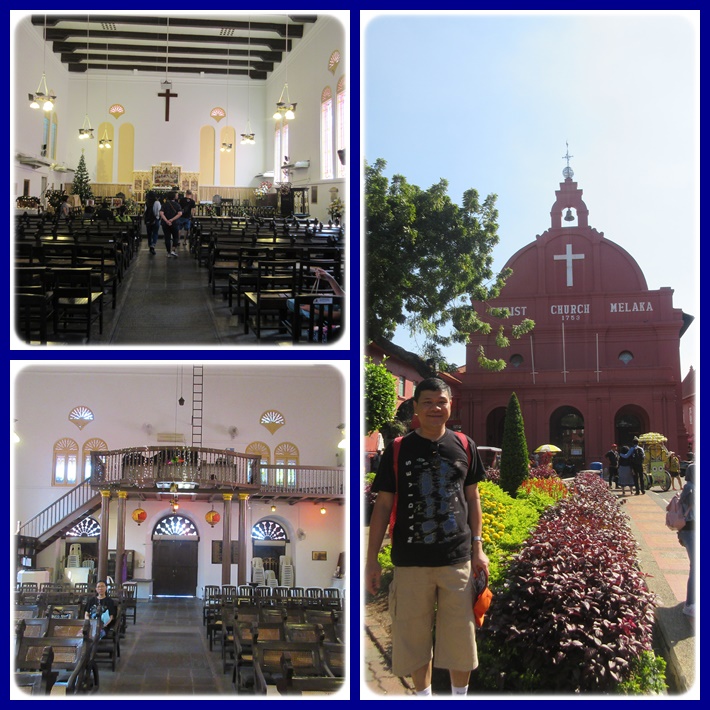 Tibalah kami di area wisata dekat Jonker Street. Betul, banyak sekali turis di sini. Yang menarik ada juga semacam becak dengan hiasan semarak yang bisa disewa untuk keliling daerah itu. Full music pula. Keren deh. Dua ikon yang menonjol di sini adalah Clock Tower dan Christ Church Melaka yang memiliki arsitektur menarik dan warna yang mencolok yaitu merah bata. Gereja ini sudah ada sejak tahun 1753. Kami sempat masuk ke dalamnya. Interior dalamnya sederhana namun karena masih dalam suasana Natal, ada pohon Natalnya. Di sisi kanan gereja, ada kios2 penjual souvenir.
