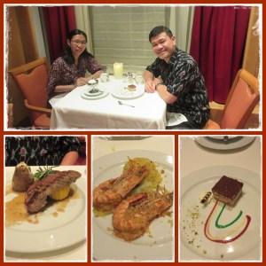 Setelah kami menikmati cocktail dari kapten kapal, kami bergegas ke acara dinner ala carte. Pilihan jatuh pada restoran Fantasia yang belum pernah kami masuki. Lagi2 karena kami hanya berdua, kami diarahkan duduk di meja paling pinggir yang memang khusus untuk berdua. Enak sekali ya jika berdua begini. Jika lebih dari 2, umumnya akan digabung di meja bundar besar kapasitas 8-10 orang, tamu lain, jadi kurang nyaman.