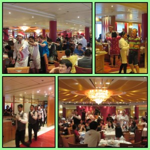 Sedang menikmati makan malam, tiba2 terdengar suara penyanyi tenor di speaker. Keras sekali. Semua penumpang terkaget. Setelah itu dari ujung restoran, sebagian pelayan mengibar2kan serbet makan dan mengajak penumpang untuk ikut mengibarkan serbet putih mengikuti irama lagu. Selesai satu lagu seriosa itu, mulailah terdengar lagu pesta khas Italia. Kemeriahan dilanjutkan dengan tarian sebagian pelayan restoran di tengah2 sambil mengajak beberapa penumpang ikut berdansa dan menari, diiringi lagu Volare. Video keseruan ini bisa dilihat di fb pasangan traveling ya.
