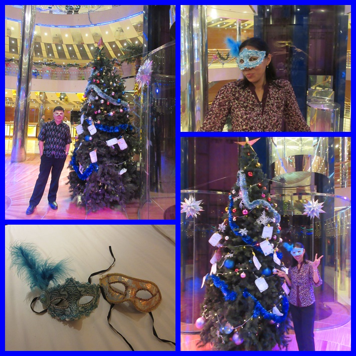Pesta berlanjut sampai pagi sepertinya. Kami sih hanya ikut sekitar 20 menit setelah dapat topeng. Lanjut foto2 aja di ruang pesta dan kemudian keluar ruangan, foto2 lagi di lift dan lobby kapal yang ada pohon natalnya. Kapan lagi foto2 pake topeng bagus gini. Kembali ke kamar sudah midnight. Sebelum tidur, kami mengisi form breakfast agar sarapan diantar ke kamar besok pagi. Iya, bisa minta breakfast di kamar. Keren ya. Form breakfast dan menu nya mirip di Maldives. Bisa baca trip Maldives (2015). Form lalu digantungkan di pintu depan kamar.
