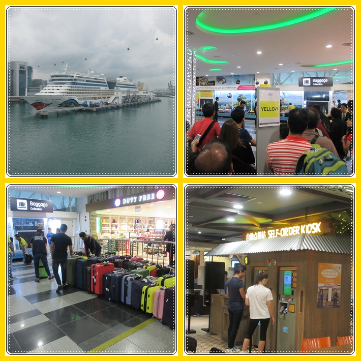 Saat mau check out, penumpang dengan luggage tag berwarna kuning, berkumpul di Concorde Plaza dengan rencana turun kapal jam 15.00. Tetapi, karena adanya kepadatan antrian imigrasi di Harbourfront, terpaksa kami terlambat turun hingga 25 menit. Saat turun, benar saja. Ada antrian sangat panjang di imigrasi Singapore. Di samping antrian kami, ada line khusus untuk visa kerja. Kami melihat ada beberapa crew cruise yang ikut antri. Mungkin tugas / kontrak mereka sudah selesai dan mereka mau pulang ke negaranya dan akan digantikan dengan crew lainnya.