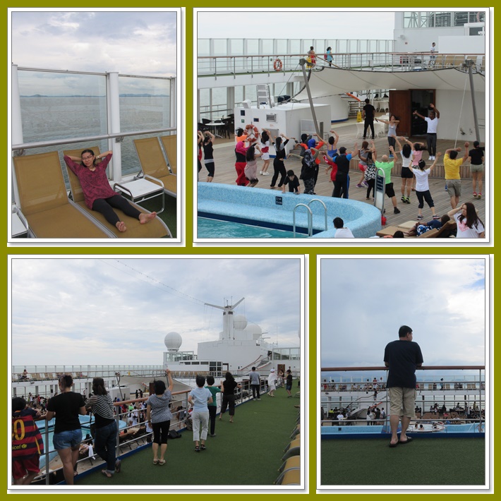 Siang ini cuacanya ga sepanas kemarin. Santai2 ah di deck kapal. Ada pelajaran zumba kali ini. Banyak juga yang ikut di depan panggung. Ada juga yang ikutan ber-olahraga dari deck 12 atau di bagian atas panggung. Ini yang malu ke depan panggung tapi penasan pengen coba, hehe.. Kami duduk2 santai di deck 12 sambil melihat2 suasana. Selalu ada acara di area pool, selalu ada makanan di kapal. Kurang apa lagi coba. Kami sih merasa kurang waktu, Jeff yang pengen belajar bahasa Italy di salah satu ruang jadi ga bisa ikutan karena bentrok dengan acara Travel Talk.