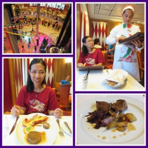 Setelah kami menikmati cocktail dari kapten kapal, kami bergegas ke acara dinner ala carte. Pilihan jatuh pada restoran Fantasia yang belum pernah kami masuki. Lagi2 karena kami hanya berdua, kami diarahkan duduk di meja paling pinggir yang memang khusus untuk berdua. Enak sekali ya jika berdua begini. Jika lebih dari 2, umumnya akan digabung di meja bundar besar kapasitas 8-10 orang, tamu lain, jadi kurang nyaman.