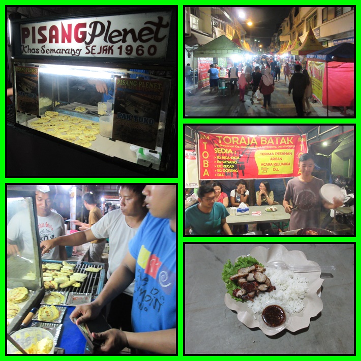 Wah, sepanjang kiri kanan jalan banyak sekali tukang makananan. Baik halal maupun non halal. Baik tradisional maupun internasional. Lengkap deh. Jeff menemukan makanan khas Semarang bernama pisang plenet. Plenet sendiri artinya menekan sesuatu hingga pipih. Yang kami makan adalah pisang plenet pak Tuko yang katanya sudah ada sejak tahun 1960 dan sekarang dikelola oleh generasi ketiga. Pisang yang digunakan adalah pisang kepok. Pisang dibakar di atas arang dan dibolak balik. Setelah matang, pisang diangkat dan ditekan menggunakan 2 papan tipis. Setelah itu, barulah dilapis topping sesuai selera. Ada coklat, kacang, keju dll. Kami pesan rasa coklat keju. Harganya per porsi Rp. 12.000. Bentuk dan rasa mirip pisang coklat keju di Jakarta, hanya pisangnya tidak dipipihkan.