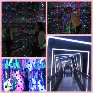 Di sini ada 14 ruangan dengan tema yang berbeda2. Ada yang berisi kaca2 dengan lampu sehingga bisa membuat foto2 yang cantik dan keren. Ada yang berupa ilusi cahaya. Ada yang menggunakan projector sehingga menciptakan gambar bergerak serupa ombak laut di bagian bawah ruangan. Ada juga area dimana kita harus berteriak untuk menyalakan lampu, jika tidak maka ruangan sangat gelap. Rupanya pakai sensor suara nih, keren. Jadilah kita teriak2 sepanjang ruangan supaya lampunya nyala terus.