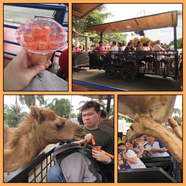 Untuk menikmati perjalanan safari ini, kita akan naik mobil mirip kereta yang terbuka. Jadi nanti kita bisa berinteraksi langsung dengan hewan2 yang ada. Bisa pegang2 dan kasi makan wortel yang dibeli terlebih dahulu saat antri. Harganya Rp. 10.000,- per satu gelas plastik dan banyak yang beli. Tapi karena ini bukan hewan yang lucu, maka wahana ini jadi mirip wahana rumah hantu karena pengunjung berteriakan, jerit2 ketakutan dan ada anak2 yang menangis. Kami sih jadi tertawa melihat situasi ini. Kasian hewannya padahal jinak dan ga salah apa2.