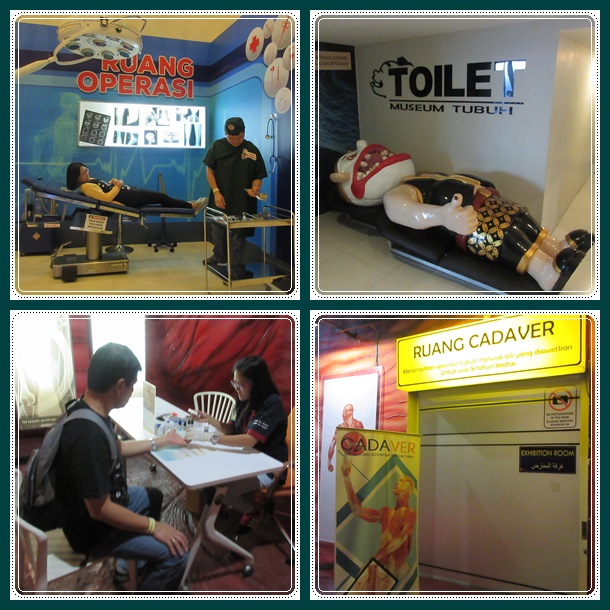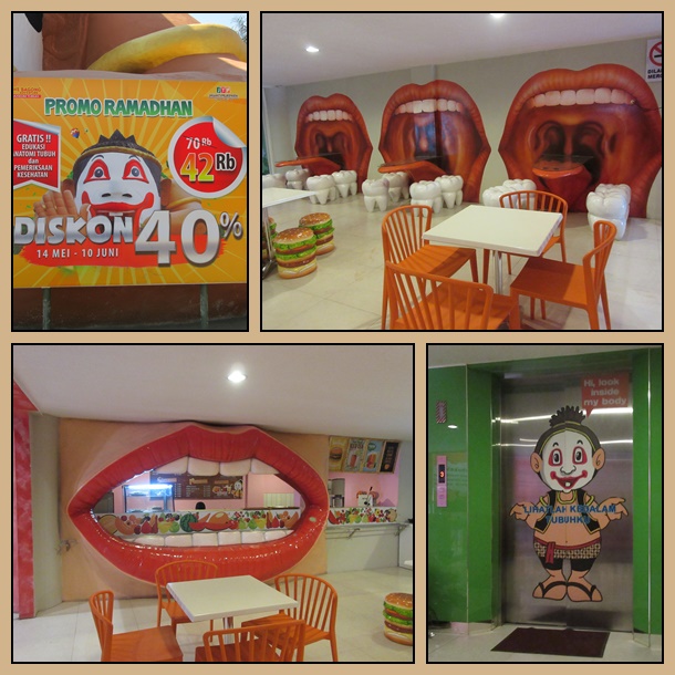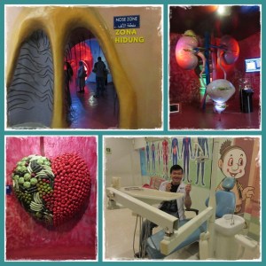 Begitu masuk, kita disambut dengan cafe gigi. Lucu deh, bentuk kursinya seperti gigi, banyak mulut2 terbuka sebagai dekorasinya dan lidah sebagai mejanya. Tempat ini adalah museum tubuh manusia pertama di Indonesia dan terbesar di Asia Tenggara. Ada banyak zona di dalam museum tubuh. Mulai dari zona gigi, telinga, hidung, otak, mata, jantung, ginjal, hati, tulang sendi, dsb. Di setiap zona, terdapat petugas yang menerangkan fungsi bagian tubuh tersebut dan kita bisa tanya jawab karena semua petugas tersebut memiliki latar belakang pendidikan dari bidang kesehatan.