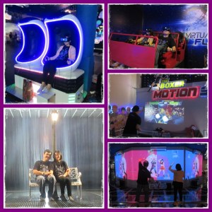 Ada tempat2 dimana kita bisa duduk di kursi yang bergerak dengan dipasangin kacamata VR nya. Sehingga penglihatan menjadi 3 dimensi, seperti asli. Tergantung filmnya apa yang diputar di kacamata VR tersebut. Ada yang roller coaster, ada yang ayunan berputar 360 derajat. Yang pasti membuat kita puyeng dan seperti betul2 naik wahana tersebut secara real.