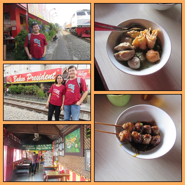 Dari situ kami lanjut ke Bakso President yang fenomenal itu. Letaknya berada persis di pinggir rel kereta api. Jadi dari tempat parkir, kami harus menyebrang rel KA untuk sampai di warung ini. Pastikan tengok kanan kiri dulu sebelum menyeberang rel. Dinamakan president sebetulnya karena dulu terletak di belakang bioskop president. Sekarang bioskop president sudah tidak ada dan berganti menjadi Hotel Savana.
