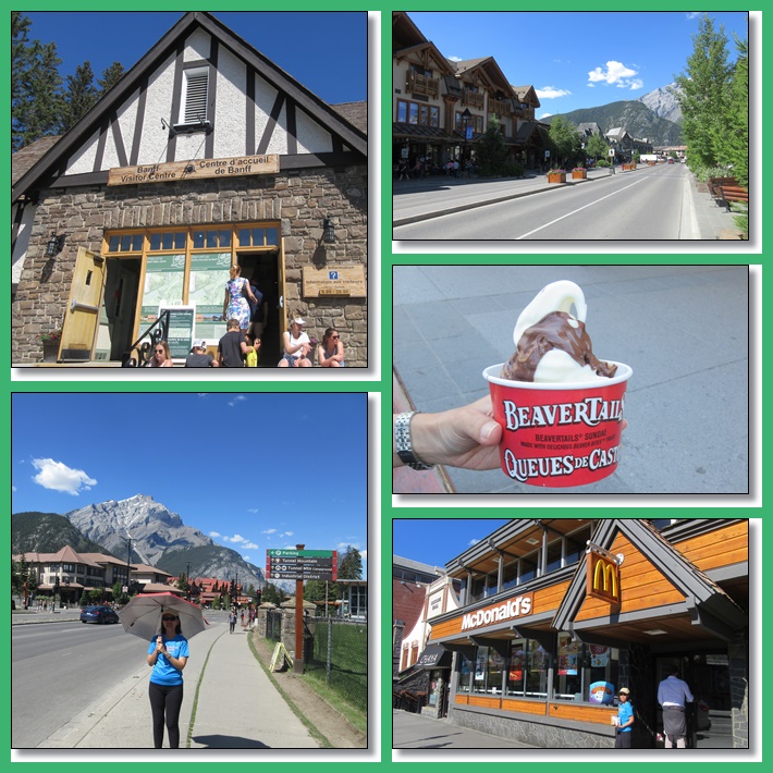 Sore ini kami jalan2 ke pusat kota Banff yang panas nya ajubile dan silau banget. Padahal sudah jam 4 lebih, tapi seperti jam 12 siang saja. Karena ga tahan, Diana memutuskan untuk pakai payung saja. Langsung terasa nyaman di kulit, ga sakit kena terik matahari. Kalo para bule sepertinya senang sih jemuran matahari. Kami sebagai orang Asia kebalikannya. Kota kecil ini sangat ramai dengan turis. Apalagi semua terpusat di sini, di mana ada visitor centre, trus semua toko2 souvenir, tempat makan, dan hotel berjejer. Jadinya kami mending beli ice cream saja deh, sambil duduk santai.