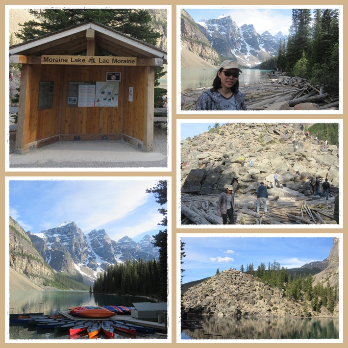 Jam 6.30 pm kami melintas lagi dan papan penutup jalan sudah dibuka. Parkir masih ramai tapi ada tempat. Penyewaan kano sudah tutup, tapi turis masih banyak berada di area danau. Katanya untuk bisa menikmati pemandangan Moraine Lake, kami harus naik ke atas rockpile. Jadi memang di depan danau ada semacam bukit dari tumpukan batu.