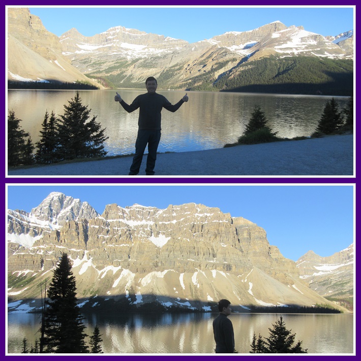 Betul saja, jam 7 pagi ini kami sibuk melihat ke kiri dan ke kanan jalan. Di mana-mana ada danau yang indah dengan latar belakang pegunungan salju. Amazing ! Sampai pegal nih leher dan Diana yang nyetir minta gantian karena sulit nengok2 santai kalo lagi nyetir kan. Kami pun stop di satu danau yang berada di pinggir jalan, namanya Bow Lake. Indaaaah banget. Lihatnya sampai mau nangis. Tuhan Maha Besar !