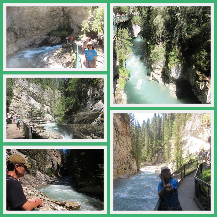 Perjalanan pun dilanjutkan, mobil mengarah ke Banff tapi kami mau stop dulu di Johnston Canyon. Di sini kita bisa menikmati lembah yang di bawahnya mengalir sungai yang cukup deras dengan hiking. Jalan setapaknya bagus, tetapi cukup sempit. Di beberapa tempat harus gantian jika berpapasan atau sedang ada yang foto2.