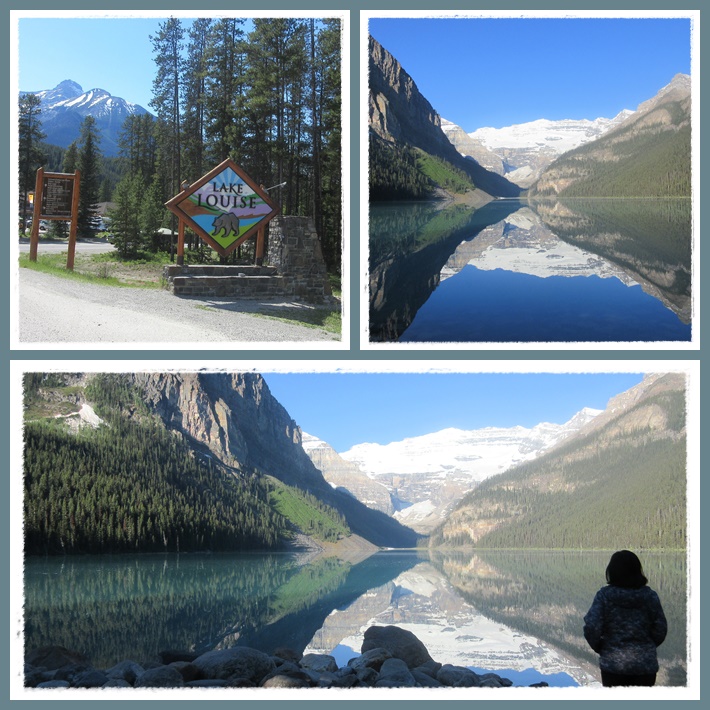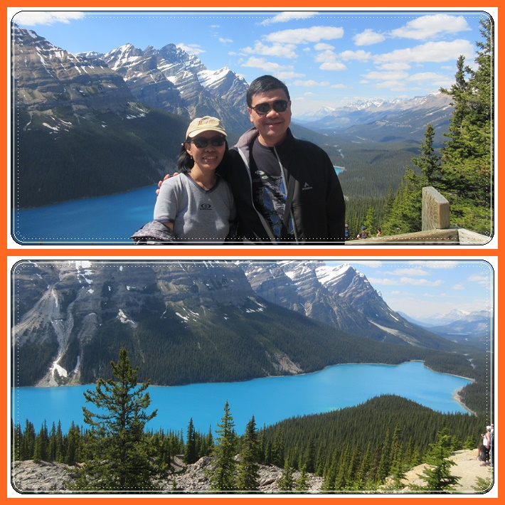 Kami tiba hampir jam 3 sore di Peyto Lake (lagi). Tentu saja, kali ini suasananya berbeda banget dengan tadi pagi kami ke sini. Banyak turis, cari parkir susah. Untung ada space kosong yang kami temukan. Kami mendaki jalan yang sama dengan tadi pagi dan berpapasan dengan banyak turis. Tiba di atas, sudah penuh turis. Susah dapat foto. Biasa deh kami mau saling foto ceritanya. Waktu kami bicara dengan bahasa Indonesia, tiba2 ada yang menawarkan bantuan foto berdua dalam bahasa Indonesia. Ternyata sepasang suami istri orang Jakarta. Akhirnya, kami saling membantu foto berdua. Kami ga berlama2 di sini dan langsung kembali ke Lake Louise.