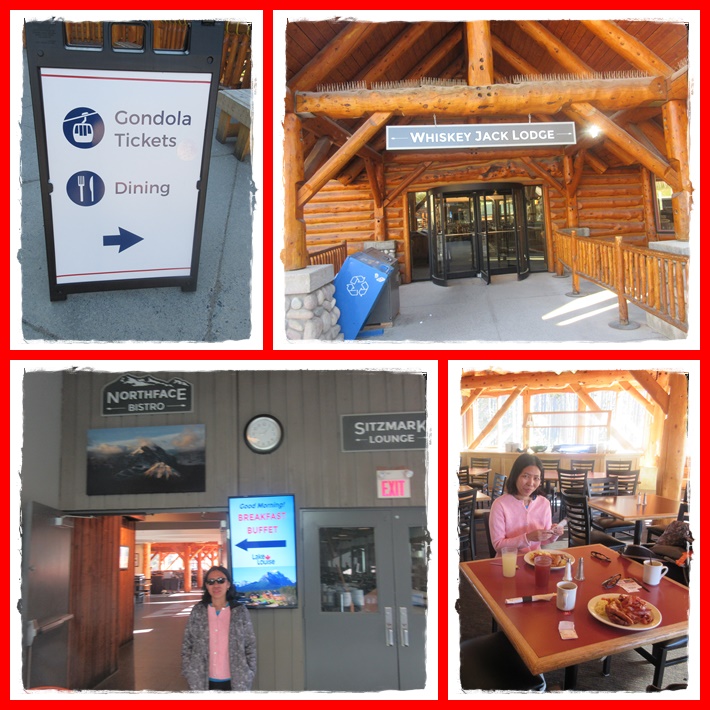 Harga gondola ride CAD.35.95/pax. Jika datang setelah jam 4.30 pm ada diskon, tapi sayang banget datang sore karena waktu terbatas, ga lama mereka tutup. Mereka juga punya paket ride & dine, jadi digabung dengan breakfast buffet di North Face bistro, harganya CAD.39.95/pax. Nah, kami pilih yang ini. Harga breakfast all you an eat jadi cuma 4 dollar per org dari harusnya CAD.17 per org. Kan murah banget tuh. Nah, ada tambahan diskon lagi CAD.5/pax dengan flyer diskon yang tersedia di kasir supermarket Samson Mall atau kupon terlampir di peta Banff-Lake Louise yang ada di Lake Louise Visitor Centre. Jadinya kami hanya bayar total CAD.73.68 untuk bedua naik gondola dan breakfast, sudah termasuk tax. Gile banget, jadi dapat sarapan sepuasnya gratis nih. Mantap !