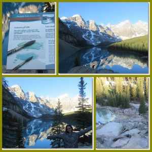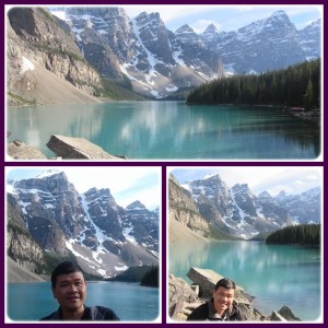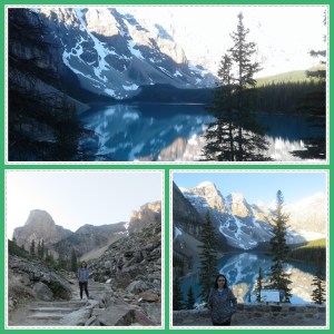 Setelah sampai kaki bukit batu, mulailah kami naik dengan cara memanjat. Cari jalan dan batu pijakan merupakan tantangan tersendiri supaya tidak terperosok. Seru juga sih, tapi kami sampai setengahnya saja deh. Sudah bagus kok untuk foto2. Ga sanggup kalo suru manjat sampe puncak. Kami pun terkagum2 membayangkan orang2 lain yang katanya naik sampai puncak. Pemandangan di sini keren banget ! Kami jauh lebih suka pemandangan gunung2 di sini daripada di Lake Louise. Danau berwarna semu hijau dan biru, tergantung sudut melihatnya. Pemandangan ini juga yang ada di mata uang CAD.20 jaman dulu, makanya disebut sebagai “twenty dollar view”.
